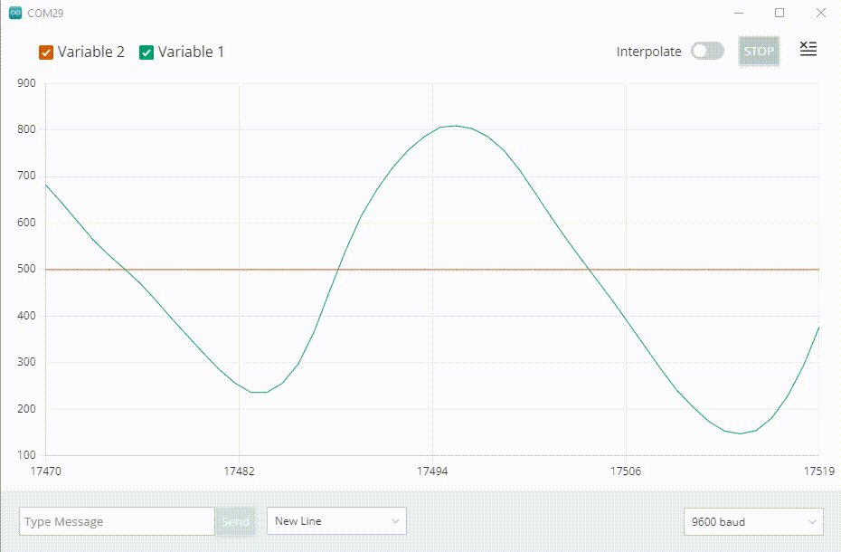 11 Serial.print("Variable_1:");12 Serial.print(random_variable);13 Serial.print(",");14 Serial.print("Variable_2:");15 Serial.println(static_variable);16}The Serial Plotter recognizes only CRLF