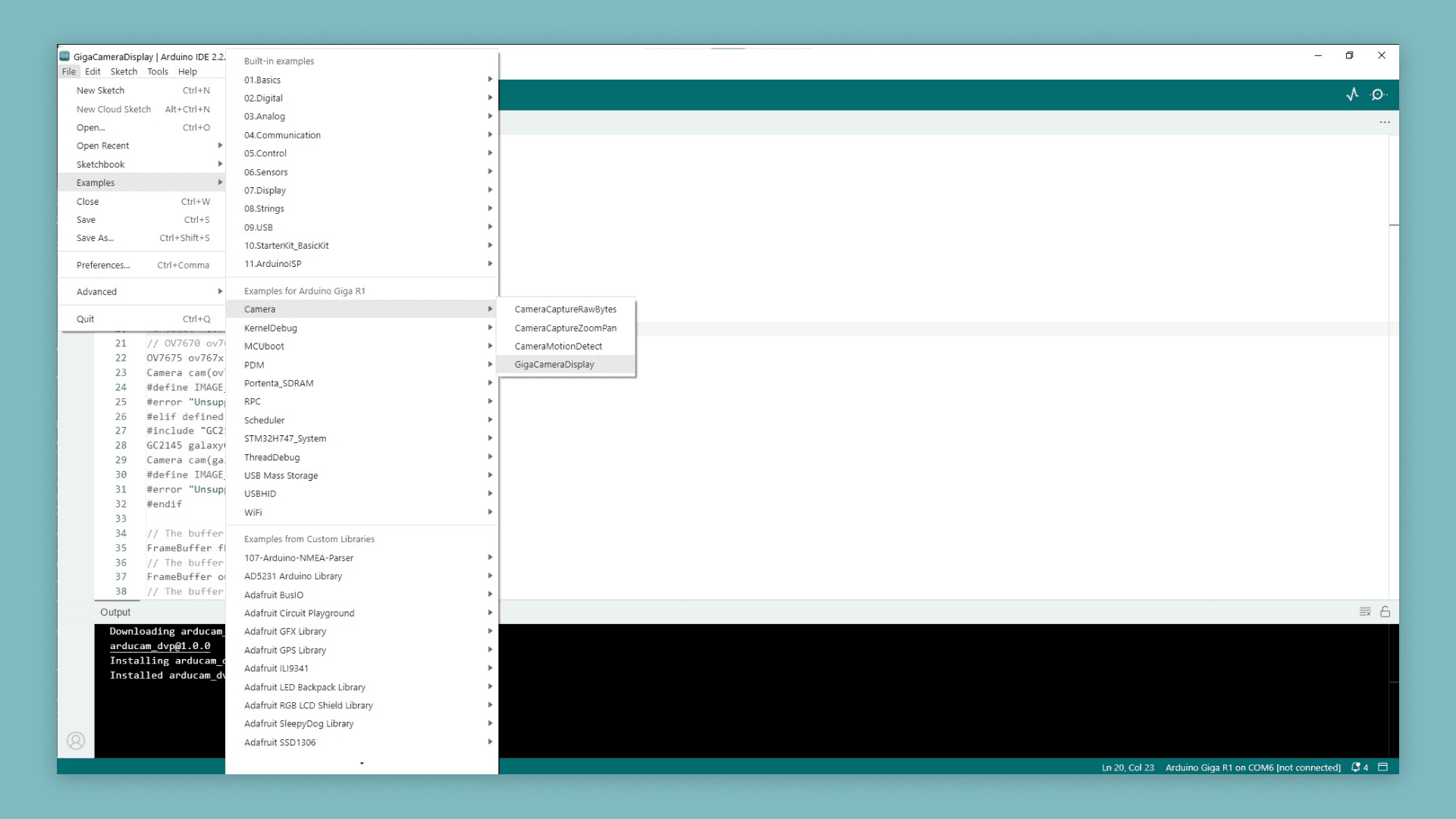 Open the example sketch by going to File > Examples > Camera > GigaCameraDisplay in the Arduino IDE.